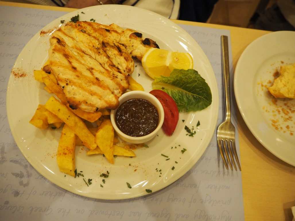 Windmill Taverna Opposite Zorbas Beach. This didn’t have a gluten free menu, but the food was delicious. I had chicken souvlaki and salad.